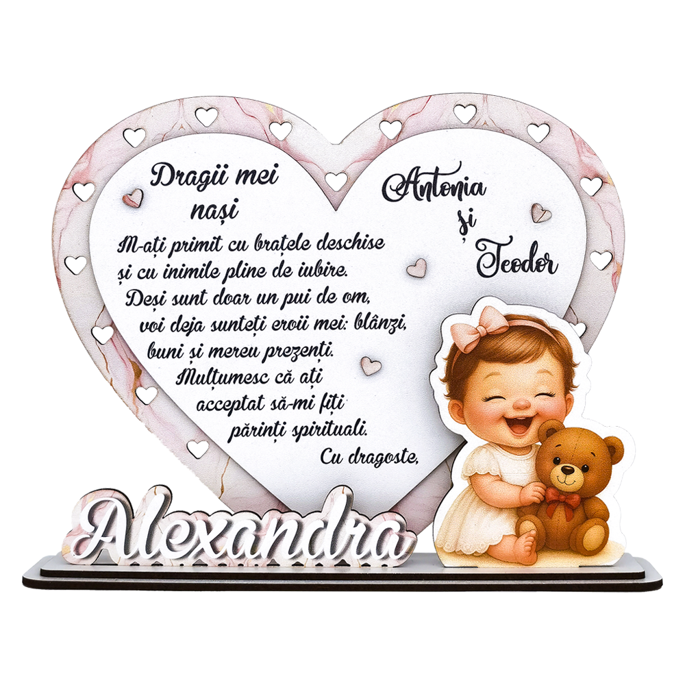 Acest obiect este un suport decorativ realizat din placaj, având forma unei inimi duble decupate cu motive de inimioare mici. Designul său elegant include un mesaj emoționant adresat nașilor, scris într-un font artistic, alături de numele acestora.