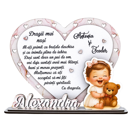 În partea dreaptă, este atașată o ilustrație adorabilă cu o fetiță veselă ținând în brațe un ursuleț de pluș, simbol al inocenței și afecțiunii. La bază, suportul este personalizat cu numele copilului, într-un stil caligrafic 3D, care iese în evidență prin efectul de relief.