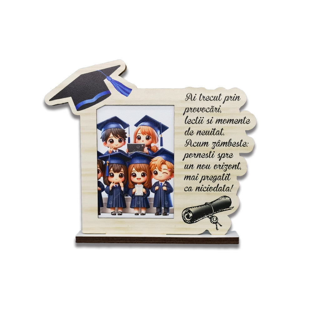 Transformă o fotografie simplă într-o amintire școlară de neprețuit. Rama foto din placaj este mai mult decât un obiect decorativ – este un simbol al finalului unui capitol important din viața unui elev. Este ideală pentru cadouri pentru clasa a IV-a, a VIII-a, a XII-a.