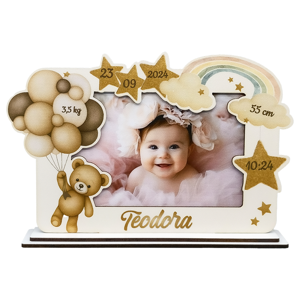 Această ramă personalizabilă din lemn este o alegere delicată și elegantă, ideală pentru a pastra vii amintirile din primele zile de viata ale bebelusului. Cu un design gândit în cele mai mici detalii, rama încorporează elemente vizuale în nuanțe calde de crem, bej și auriu, fiind decorată cu ursuleți, baloane, steluțe și un curcubeu în tonuri pastel. Dimensiunea ramei este de 24x17 cm, iar spațiul dedicat fotografiei este de 15x10 cm – potrivit pentru un portret expresiv al bebelusului.