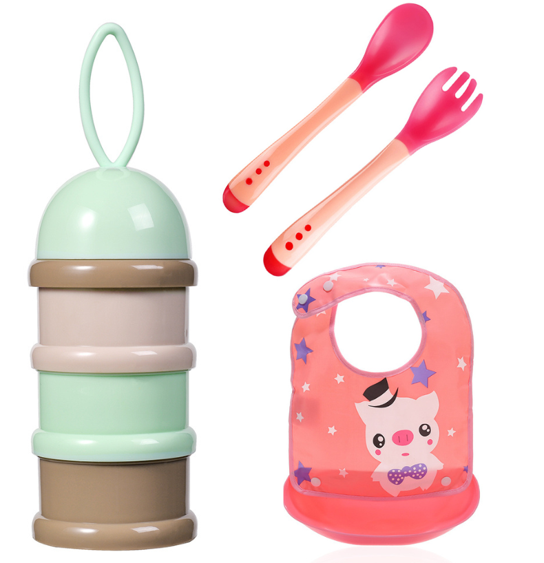 Set hrănire bebeluși 3 în 1 - tacâmuri, recipient lapte și bavețică roșie