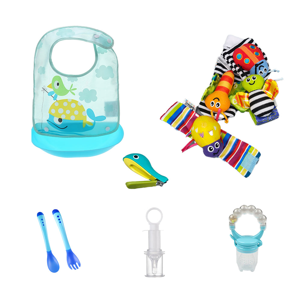 Acest set esențial pentru bebeluși este creat pentru a oferi părinților toate instrumentele necesare în primele etape ale dezvoltării micuțului. Fiecare produs din set este gândit pentru a asigura siguranță, confort și distracție pentru bebeluș, făcând fiecare moment mai ușor și mai plăcut. Setul include o bavetă din silicon cu coșuleț, șosete cu zornăitoare, suzetă pentru fructe, seringă gradată, tacâmuri termice și o unghiera.